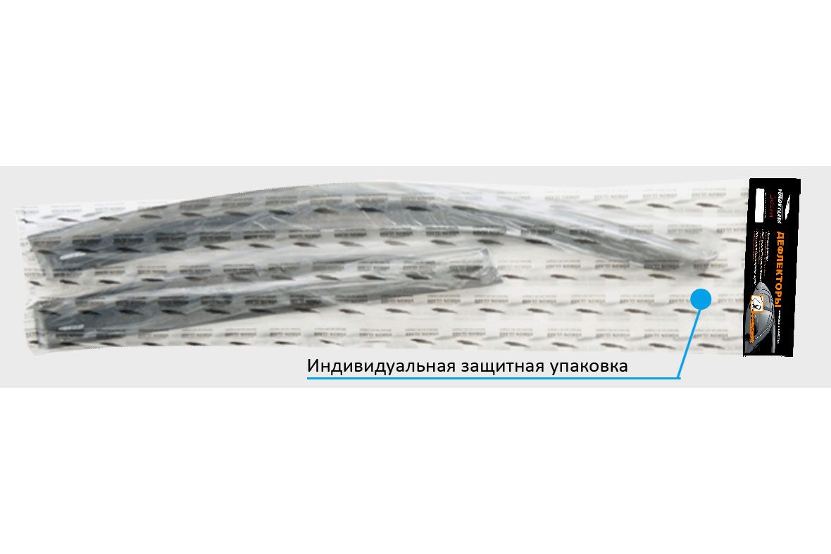 Дефлекторы выполнены из поликарбоната – гибкого и прочного материала. Устойчивы к механическому воздействию и ультрафиолету. Эксплуатация без сколов и трещин. Надежная фиксация, благодаря профессиональному скотчу 3М с высокой адгезией. Отсутствие шума при эксплуатации. Проверенная аэродинамическая форма дефлектора позволяет использовать его без посторонних звуков даже на высоких скоростях. Каждый дефлектор упакован в защитную пленку, гарантирующую отсутствие пыли и царапин