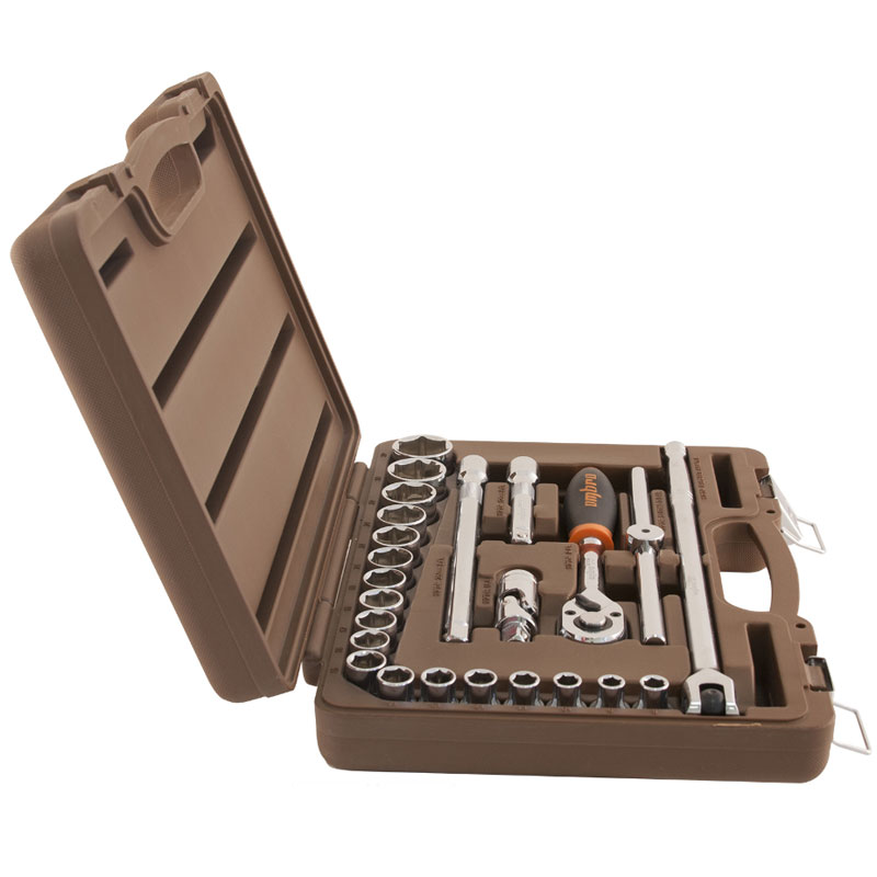 Головки торцевые 1/2 , 18 шт. 8, 9, 10, 11, 12, 13, 14, 15, 16, 17, 18, 19, 21, 22, 24, 27, 30, 32 мм. Удлинитель 1/2 125 ММ Трещоточная рукоятка 1/2 Шарнир карданный 1/2 Вороток т-образный 1/2 Гибкая рукоятка 1/2 , 375 мм. Пластиковый кейс Цветная упаковка