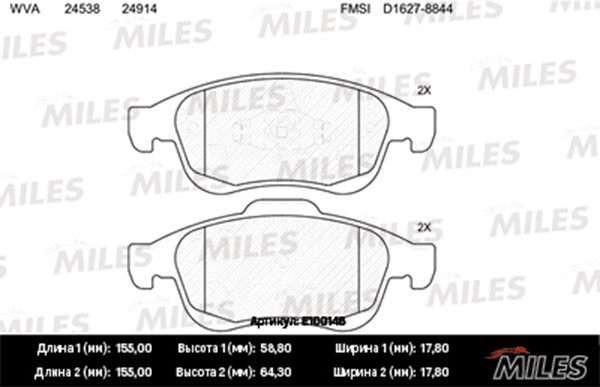 Технические характеристики товара «Тормозные колодки передние MILES E100146»