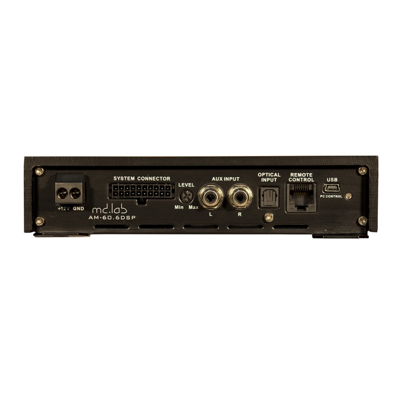 Шестиканальный усилитель со встроенным процессором AM-60.6DSP обладает широчайшими коммуникационными способностями. Помимо традиционных линейных входов и входов высокого уровня, усилителсь оснащён цифровым оптическим входом. Кроме этого, усилитель может работать в паре с блоком MD.Lab AM-WF.