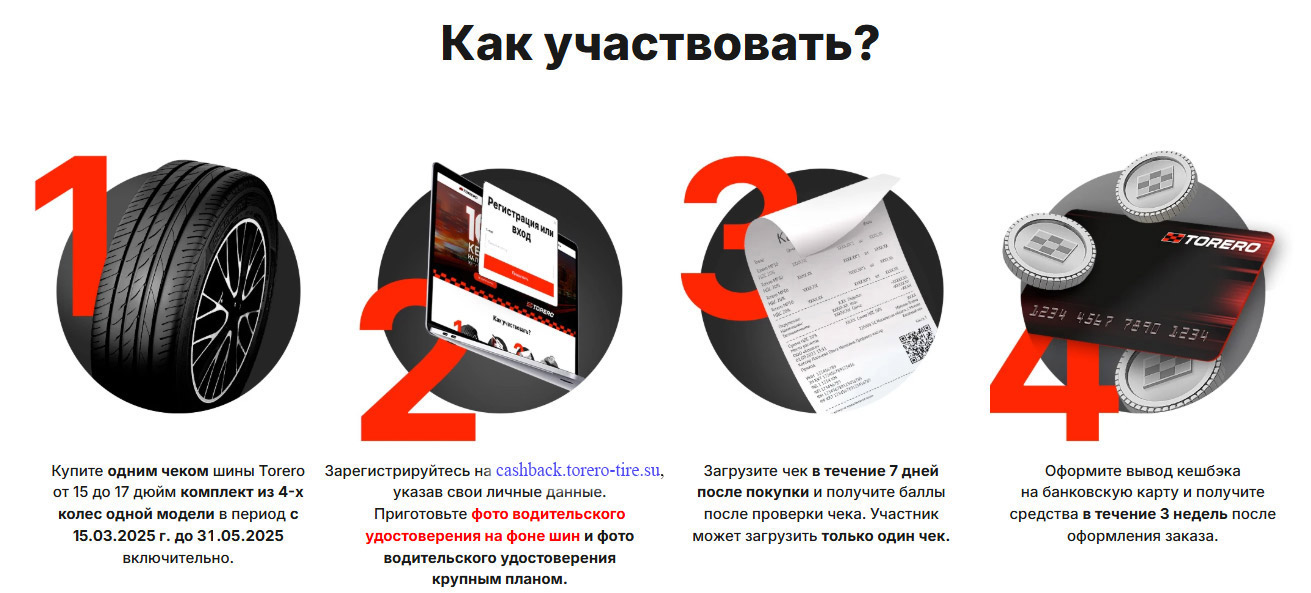 Вся информация, а также регистрация доступны на платформе по адресу https://cashback.torero-tire.su