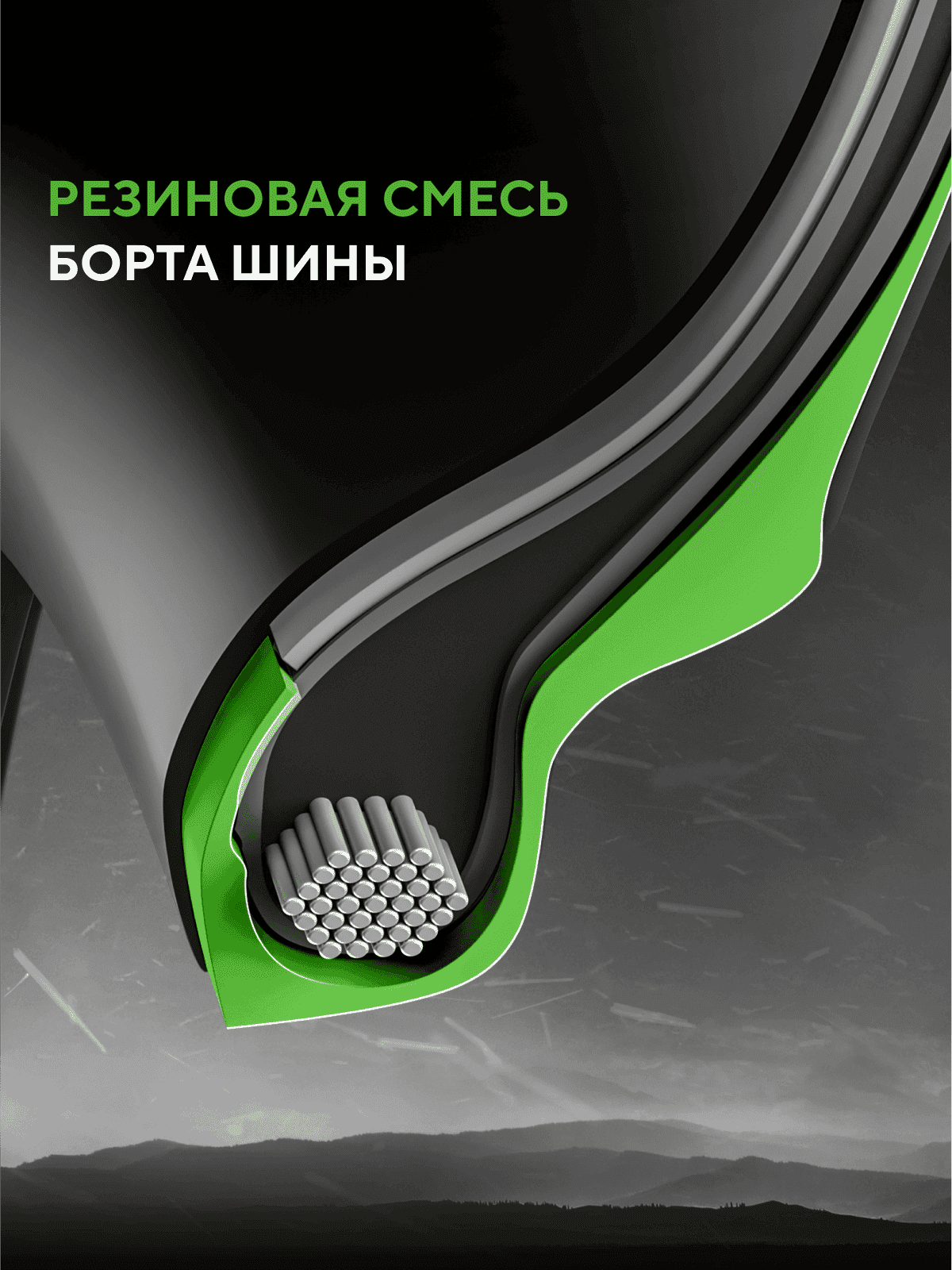 Состав резиновой смеси борта шины позволяет амортизировать и снижать вибрации шины во время движения. Особая форма навивки бортового кольца облегчает монтирование шины и вместе с тем надежно удерживает шину на ободе.