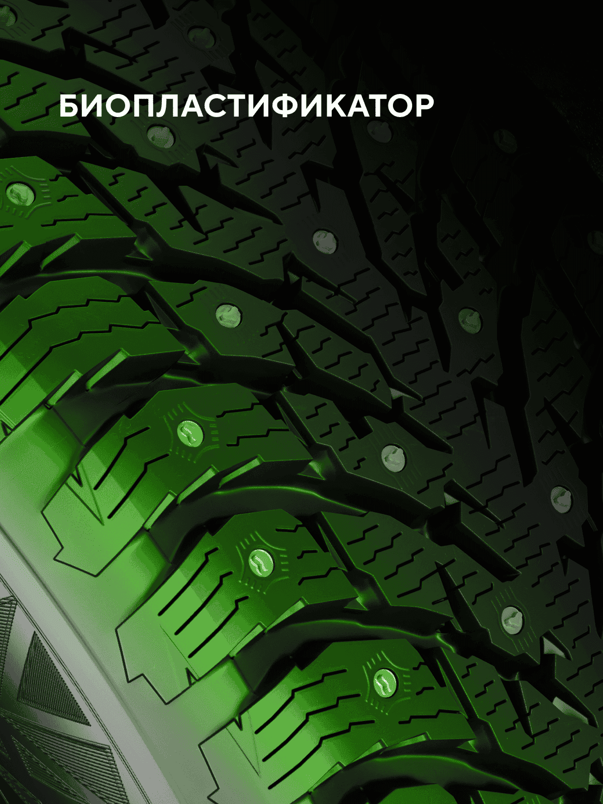 В шине Ikon Autograph Ice 9 используется два вида шипов. Одни специально разработаны для центральной части протектора, а другие – для плечевых зон. Технология ошиповки двумя видами шипов обеспечивает высокое продольное сцепление при ускорении и торможении, а также поперечное сцепление при прохождении поворотов и перестроении на обледенелой и заснеженной поверхности.