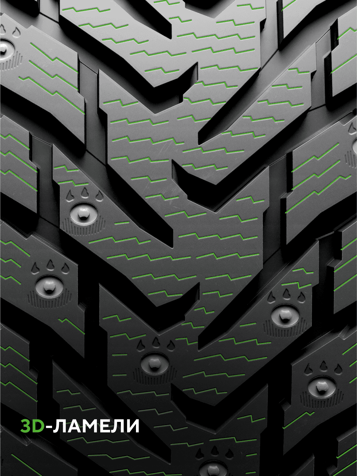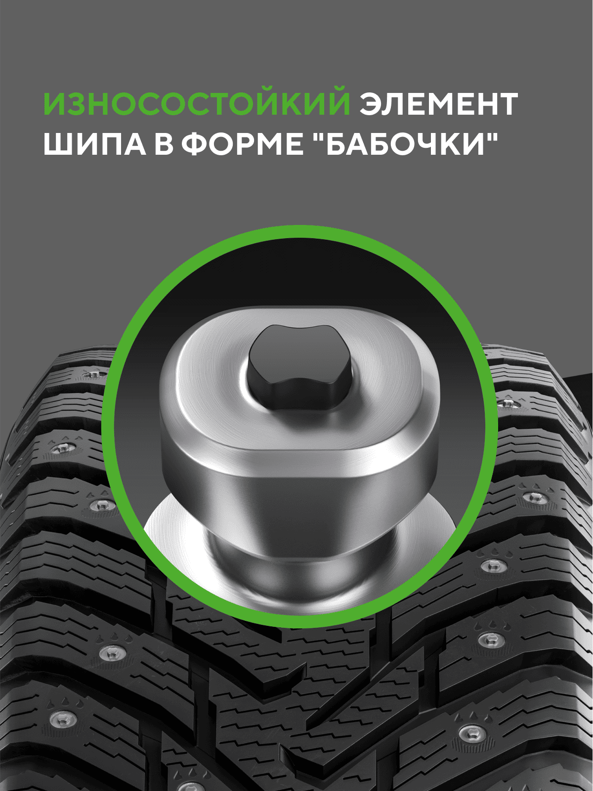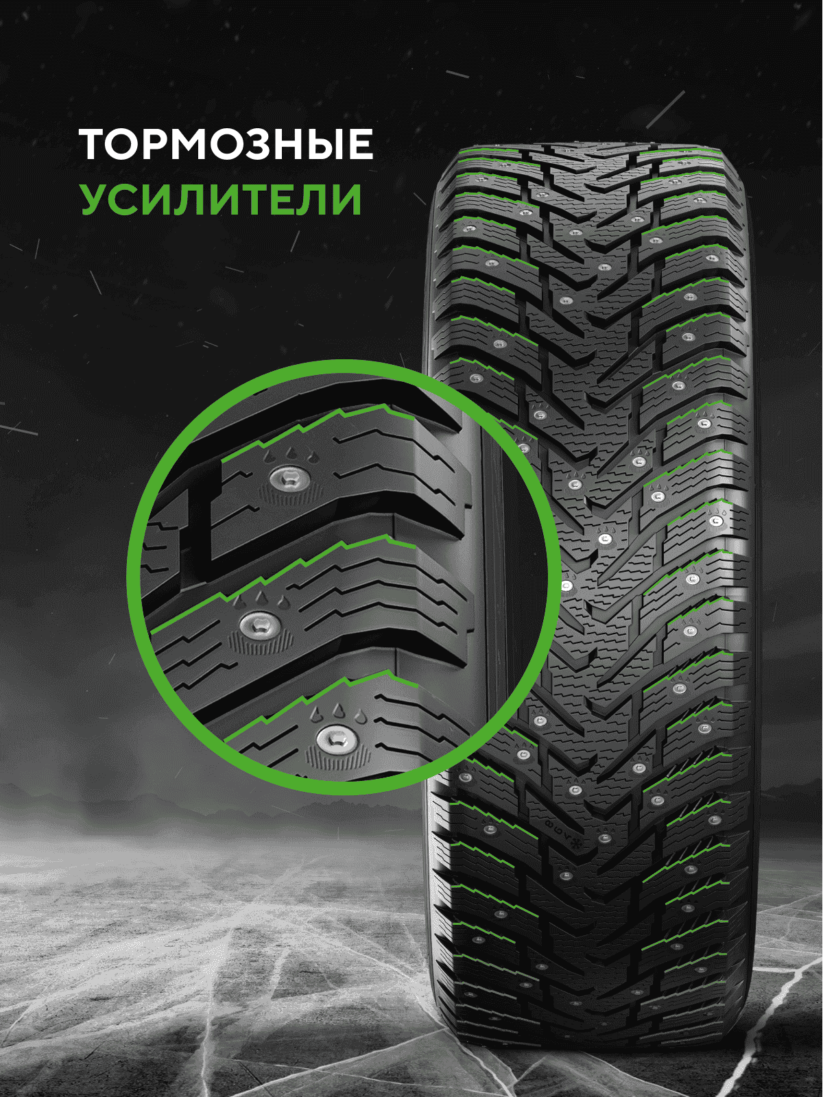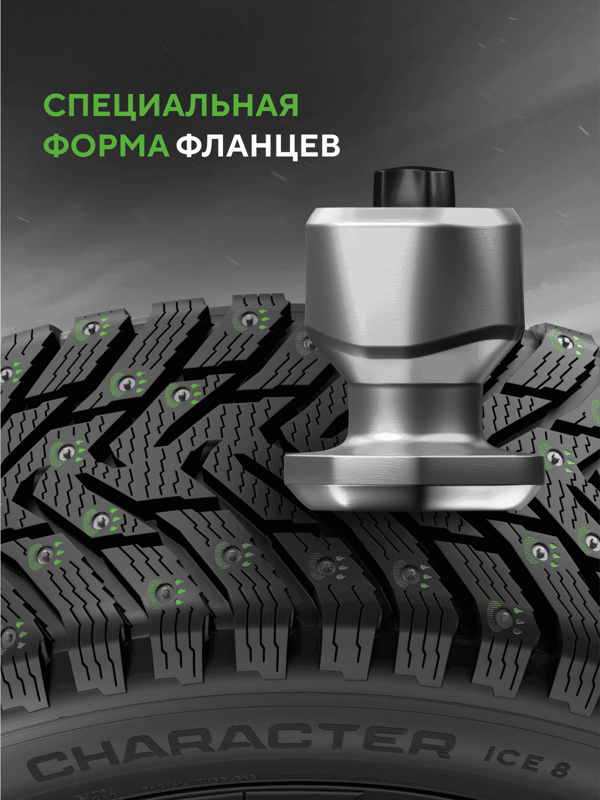 Шипованные шины Ikon Character Ice 8 (до 2025 года модель называлась Ikon Nordman 8) имеют увеличенное количество оптимально распределённых по пятну контакта шипов, что обеспечивает превосходное сцепление на зимней дороге. Высокая управляемость при маневрировании достигается благодаря объемной форме ламелей, которые поддерживают друг друга при нагрузке, предотвращая раскачивание блоков протектора. Шины позволяют легко и точно управлять автомобилем как на скользких дорогах, так и при плюсовых температурах. Специальный состав резиновой смеси и дизайн шипов повышают акустический комфорт в салоне автомобиля, делая процесс вождения более приятным вне зависимости от сложности дороги.